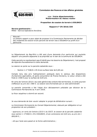 Le présent rapport a pour objet de proposer à la Commission Permanente de décider des modalités de cession d'une parcelle de terrain sise à SOLBACH au profit d'un particulier.