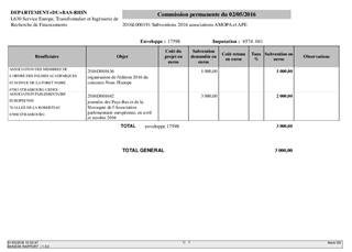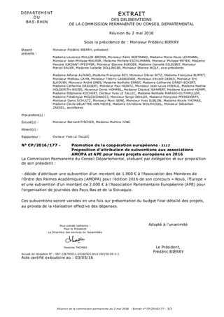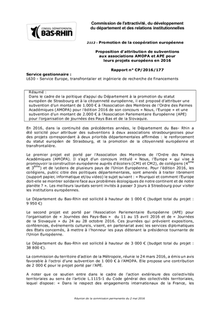 Dans le cadre de la politique d'appui du Département à la promotion du statut européen de Strasbourg et à la citoyenneté européenne, il est proposé d'attribuer une subvention d’un montant de 1.000 € à l’Association des Membres de l’Ordre des Palmes Académiques (AMOPA) pour l’édition 2016 de son concours « Nous, l’Europe » et une subvention d'un montant de 2.000 € à l'Association Parlementaire Européenne (APE) pour l’organisation de journées des Pays Bas et de la Slovaquie.