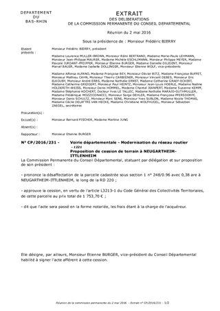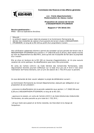 Le présent rapport a pour objet de proposer à la Commission Permanente de décider des modalités de cession d'une parcelle de terrain située à NEUGARTHEIM-ITTLENHEIM, le long de la RD 220 au profit d'un propriétaire riverain.
