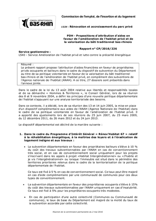 Le présent rapport propose l'attribution d'aides financières en faveur de propriétaires privés occupants et bailleurs dans le cadre du dispositif de subvention du Département au titre de sa politique volontariste en faveur de la valorisation du bâti traditionnel bas-rhinois et de l'amélioration de l'habitat privé, en complément des subventions de l'Agence nationale de l'habitat (ANAH). A ce titre, 27 dossiers sont présentés dans l'annexe jointe.