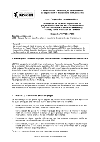 Le présent rapport vise à proposer un soutien, notamment financier, à l'Ecole Supérieure en Travail Educatif et Social de Strasbourg (ESTES) pour la réalisation de la deuxième phase du projet d'échanges transfrontaliers en matière de protection de l'enfance qui se déroulera sur la période 2016-2017.