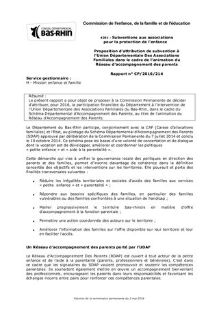 Le présent rapport a pour objet de proposer à la Commission Permanente de décider d'attribuer, pour 2016, la participation financière du Département à l'intervention de l'Union Départementale des Associations Familiales du Bas-Rhin, dans le cadre du Schéma Départemental d'Accompagnement des Parents, au titre de l'animation du Réseau d'Accompagnement des Parents.