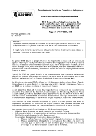 Le présent rapport propose la validation du guide de gestion relatif au suivi et à la programmation du logement locatif social « SPLS » sur le territoire du Bas-Rhin. Il s'agit d'une démarche qui s'impose à tous les territoires de délégation des aides à la pierre de l'Etat dans le domaine du parc HLM.