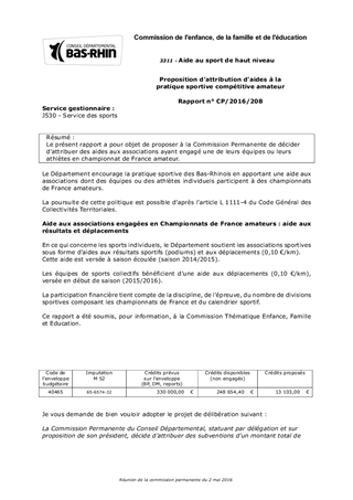 Le présent rapport a pour objet de proposer à la Commission Permanente de décider d'attribuer des aides aux associations ayant engagé une de leurs équipes ou leurs athlètes en championnat de France amateur.