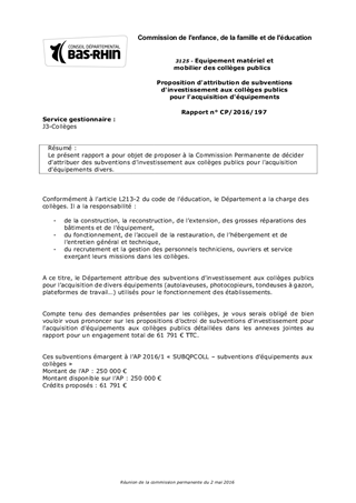 Le présent rapport a pour objet de proposer à la Commission Permanente de décider d'attribuer des subventions d'investissement aux collèges publics pour l'acquisition d'équipements divers.