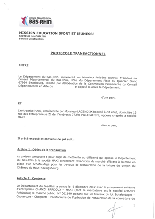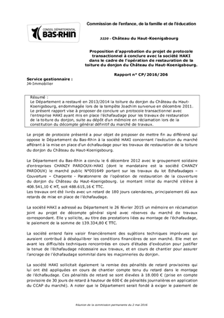 Le Département a restauré en 2013/2014 la toiture du donjon du Château du Haut-Koenigsbourg, endommagée lors de la tempête Joachim survenue en décembre 2011. Le présent rapport vise à proposer de conclure un protocole transactionnel avec l'entreprise HAKI ayant mis en place l'échafaudage pour les travaux de restauration de la toiture du donjon, suite au dépôt d'un mémoire en réclamation lors de la constitution du décompte général définitif du marché de travaux.