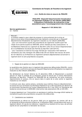 Le présent rapport a pour objet de proposer le renouvellement de la mise en oeuvre d'une action d'accompagnement des habitants concernés par le Dispositif départemental d'éradication du logement insalubre ou non décent (DDELIND) - pour une intervention auprès des propriétaires de logements locatifs ayant fait l'objet d'une plainte auprès du DDELIND, action réalisée par deux associations: la Confédération Nationale du Logement du Bas-Rhin (CNL 67) et l'Union Départementale de la Confédération Syndicale des Familles du Bas-Rhin (UD-CSF 67). - pour l'assistance à maîtrise d'ouvrage réalisée par l'association AVA habitat et nomadisme pour des ménages très défavorisés afin de réaliser des travaux de sortie de non-décence ou d'infractions au règlement sanitaire départemental concernant le logement dont ils sont propriétaires occupants.