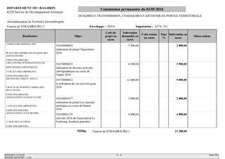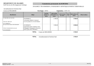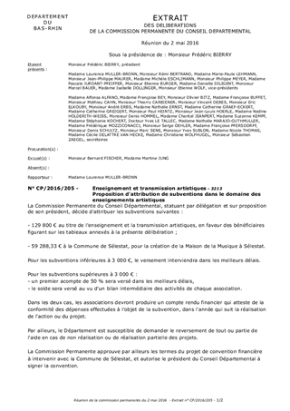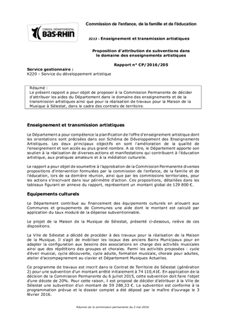Le présent rapport a pour objet de proposer à la Commission Permanente de décider d'attribuer les aides du Département dans le domaine des enseignements et de la transmission artistiques ainsi que pour la réalisation de travaux pour la Maison de la Musique à Sélestat, dans le cadre des contrats de territoire.