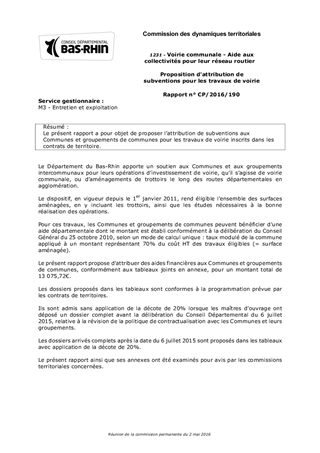 Le présent rapport a pour objet de proposer l’attribution de subventions aux Communes et groupements de communes pour les travaux de voirie inscrits dans les contrats de territoire.