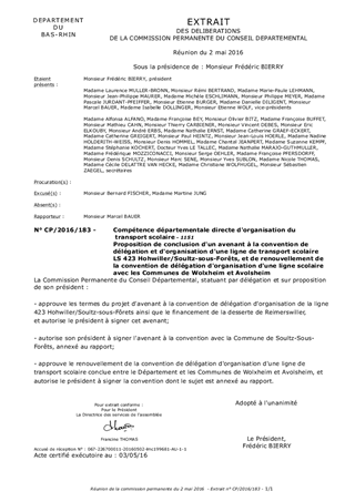 Depuis septembre 2002, la Commune de Soultz-sous-Forêts organise et finance un transport pour les élèves de Hohwiller scolarisés à l'école élémentaire de Soultz-sous-Forêts, sur délégation de compétence du Département. Cette délégation est renouvelée chaque année. A compter de septembre 2014, le Département a sollicité auprès de la Commune de Soultz-sous-Forêts, la prise en charge, sur cette ligne, d'un écolier originaire de Reimerswiller. Une convention a été conclue le 5 janvier 2016 qui doit être revue pour intégrer les résultats de l'appel d'offre lancé par la Commune et réduire ainsi le coût supporté par le Département. Par ailleurs, le présent rapport a également pour objet de proposer de renouveler la convention de délégation d'organisation d'une ligne de transport scolaire conclue entre le Département et les Communes de Wolxheim et Avolsheim.