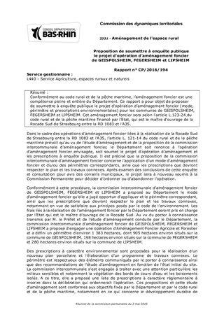 Conformément au code rural et de la pêche maritime, l’aménagement foncier est une compétence pleine et entière du Département. Ce rapport a pour objet de proposer de soumettre à enquête publique le projet d'opération d’aménagement foncier (mode, périmètre et prescriptions environnementales) pour les communes de GEISPOLSHEIM, FEGERSHEIM et LIPSHEIM. Cet aménagement foncier sera selon l'article L.123-24 du code rural et de la pêche maritime financé par l'Etat, qui est le maître d'ouvrage de la Rocade Sud de Strasbourg entre la RD 1083 et l’A35.