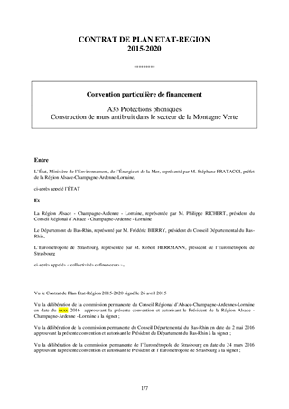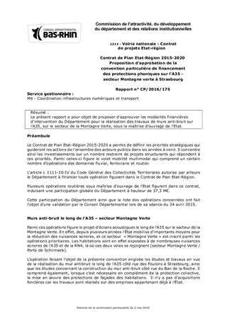 Contrat de Plan Etat-Région 2015-2020 Proposition d'approbation de la convention particulière de financement des protections phoniques sur l'A35 - secteur Montagne verte à Strasbourg