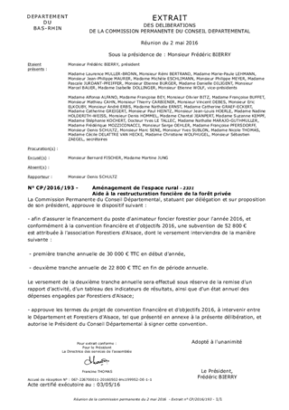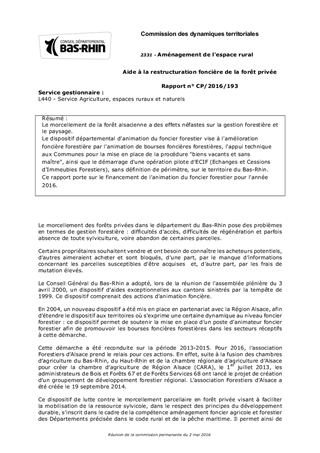 Le morcellement de la forêt alsacienne a des effets néfastes sur la gestion forestière et le paysage. Le dispositif départemental d'animation du foncier forestier vise à l'amélioration foncière forestière par l'animation de bourses foncières forestières, l'appui technique aux Communes pour la mise en place de la procédure "biens vacants et sans maître", ainsi que le démarrage d'une opération pilote d'ECIF (Echanges et Cessions d'Immeubles Forestiers), sans définition de périmètre, sur le territoire du Bas-Rhin. Ce rapport porte sur le financement de l'animation du foncier forestier pour l'année 2016.