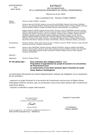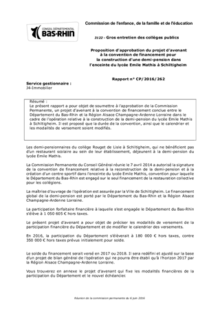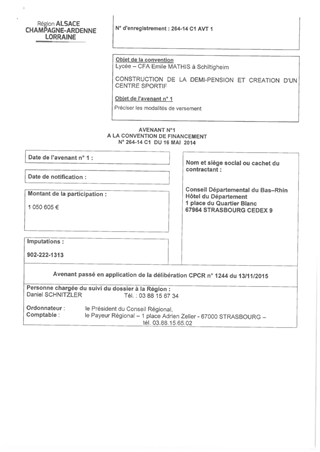 Le présent rapport a pour objet de soumettre à l'approbation de la Commission Permanente, un projet d'avenant à la convention de financement conclue entre le Département du Bas-Rhin et la Région Alsace Champagne-Ardenne Lorraine dans le cadre de l’opération relative à la construction de la demi-pension du lycée Emile Mathis à Schiltigheim. Il est proposé que la durée de la convention, ainsi que le calendrier et les modalités de versement soient modifiés.