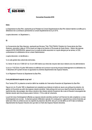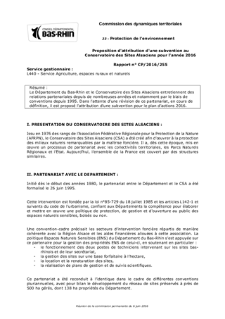 Le Département du Bas-Rhin et le Conservatoire des Sites Alsaciens entretiennent des relations partenariales depuis de nombreuses années et notamment par le biais de conventions depuis 1995. Dans l'attente d'une révision de ce partenariat, en cours de définition, il est proposé l'attribution d'une subvention pour le plan d'actions 2016.