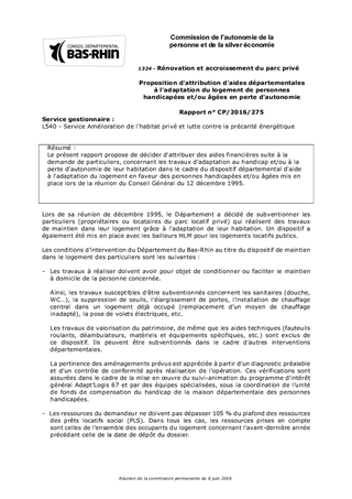 Le présent rapport propose de décider d'attribuer des aides financières suite à la demande de particuliers, concernant les travaux d'adaptation au handicap et/ou à la perte d'autonomie de leur habitation dans le cadre du dispositif départemental d'aide à l'adaptation du logement en faveur des personnes handicapées et/ou âgées mis en place lors de la réunion du Conseil Général du 12 décembre 1995.