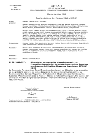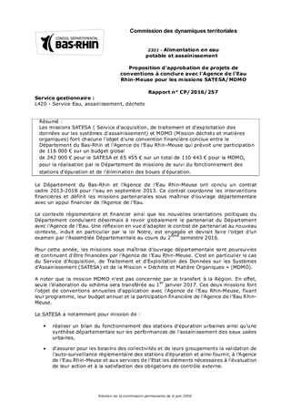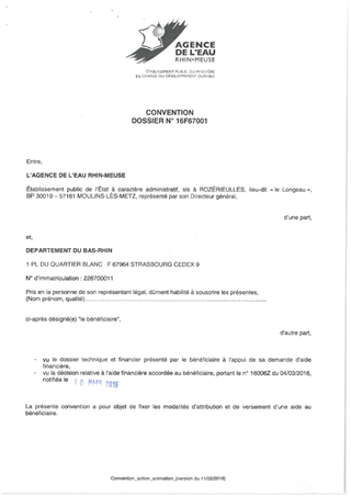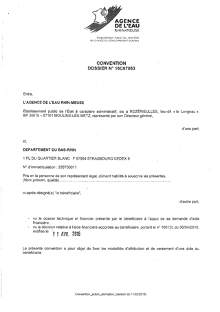 Les missions SATESA ( Service d'acquisition, de traitement et d'exploitation des données sur les systèmes d'assainissement) et MDMO (Mission déchets et matières organiques) font chacune l'objet d'une convention financière conclue entre le Département du Bas-Rhin et l'Agence de l’Eau Rhin-Meuse qui prévoit une participation de 116 000 € sur un budget global de 242 000 € pour le SATESA et 65 455 € sur un total de 110 443 € pour la MDMO, pour la réalisation par le Département de missions de suivi du fonctionnement des stations d'épuration et de l'élimination des boues d'épuration.