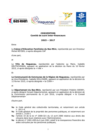 Le présent rapport a pour objet de proposer à la Commission Permanente de décider de renouveler la convention relative au Comité de suivi inter-financeurs, conclue entre la Caisse d'Allocations Familiales du Bas-Rhin, la Ville de Haguenau, la Communauté de Communes de la Région de Haguenau et le Département du Bas-Rhin.