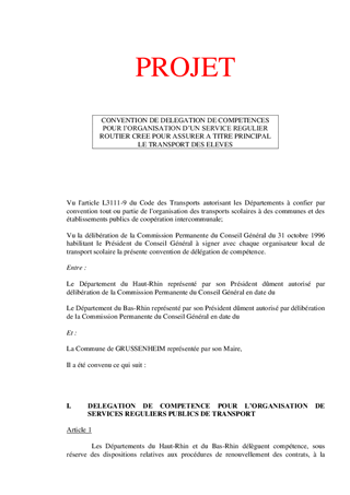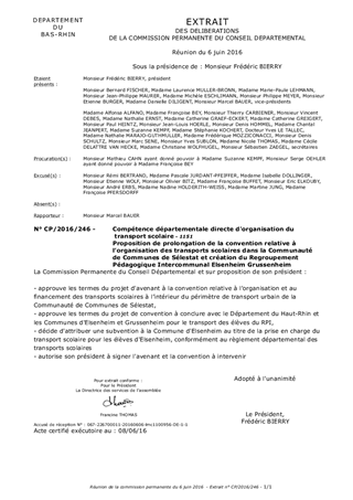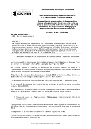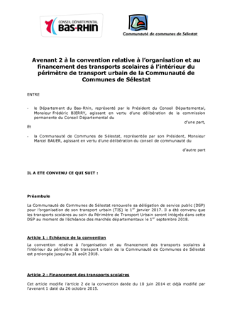 Ce rapport a pour objet de proposer à la Commission Permanente de décider de la prolongation de la durée d'application de la convention relative à l’organisation et au financement des transports scolaires à l’intérieur du périmètre de transport urbain de la Communauté de Communes de Sélestat, et la conclusion d'une convention avec le Département du Haut-Rhin et les Communes d'Elsenheim et Grussenheim pour le transport des élèves du RPI créé le 1er septembre 2016.