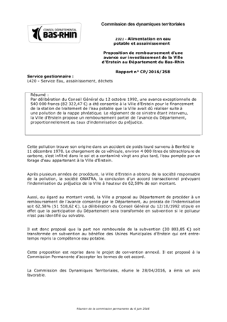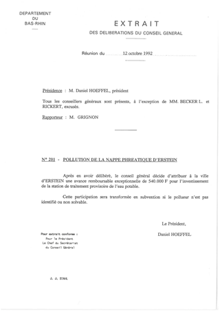 Par délibération du Conseil Général du 12 octobre 1992, une avance exceptionnelle de 540 000 francs (82 322,47 €) a été consentie à la Ville d’Erstein pour le financement de la station de traitement de l’eau potable que la Ville avait dû réaliser suite à une pollution de la nappe phréatique. Le règlement de ce sinistre étant intervenu, la Ville d'Erstein propose un remboursement partiel de l'avance du Département, proportionnellement au taux d'indemnisation du préjudice.