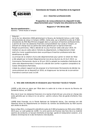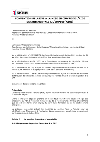 La loi du 1er décembre 2008 généralisant le Revenu de Solidarité Active a créé l’aide personnalisée de retour à l’emploi (APRE). Cette aide, qui a bénéficié à près de 5 000 allocataires du RSA Bas-Rhinois engagés dans un parcours d’insertion professionnelle, a permis de lever les obstacles financiers compromettant leur accès à l’emploi, en prenant en charge tout ou partie des coûts générés par la reprise d’activité. Malgré sa pertinence, l’Etat a décidé de ne plus financer cette aide pour 2015. En mettant en œuvre cette aide à l’échelle du département, le Département s’était doté d’un levier supplémentaire dans sa politique d’insertion professionnelle des bénéficiaires du RSA. Le principe de la création d’une aide départementale pour pallier le retrait de l’Etat a été adopté par le Conseil Départemental lors de sa réunion du 24 Avril 2015. La Commission Permanente réunie le 29 juin 2015 a adopté les modalités d’attribution de cette aide départementale à l’emploi et a décidé d'en confier la gestion comptable à la Caisse d'Allocations Familiales. L’objet du présent rapport est de proposer à la Commission Permanente de décider du renouvellement de ce dispositif en 2016, et d'approuver les termes de la convention financière à conclure avec la CAF.