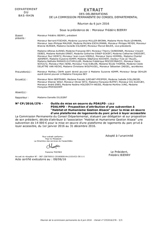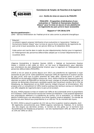 Le présent rapport propose l'attribution d'une subvention à l'association "Habitat et Humanisme Gestion Alsace" pour la mise en œuvre d'une plateforme de logements du parc privé à loyer accessible, du 1er janvier 2016 au 31 décembre 2016. Cette action est inscrite dans le cadre du plan départemental d'action pour le logement et l'hébergement des personnes défavorisées adopté par le Conseil Départemental le 2 novembre 2015.