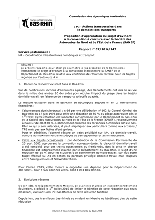 Le présent rapport a pour objet de soumettre à l’approbation de la Commission Permanente le projet d’avenant à la convention établie entre la SANEF et le Département du Bas-Rhin relative aux conditions de réduction tarifaire pour les trajets réguliers sur l'autoroute A 4.