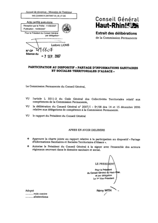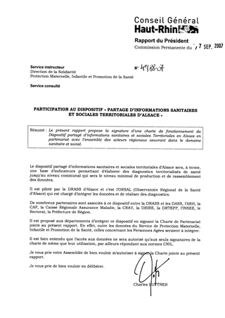 Le présent rapport propose la signature d’une charte de fonctionnement du Dispositif partagé d’informations sanitaires et sociales Territoriales en Alsace en partenariat avec l’ensemble des acteurs régionaux oeuvrant dans le domaine sanitaire et social.