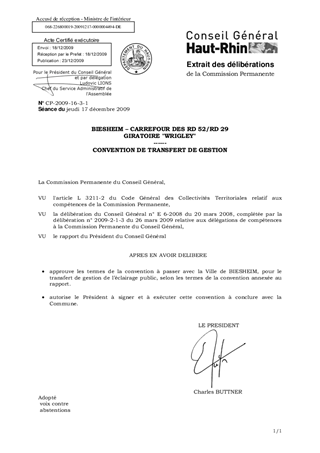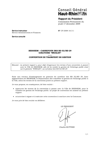 BIESHEIM – CARREFOUR DES RD 52/RD 29 GIRATOIRE "WRIGLEY" ------ CONVENTION DE TRANSFERT DE GESTION