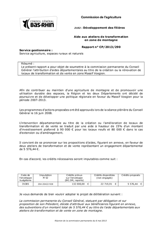 Le présent rapport a pour objet de soumettre à la commission permanente du Conseil Général l'attribution d'aides départementales au titre de la création ou la rénovation de locaux de transformation et de vente en zone Massif Vosgien.